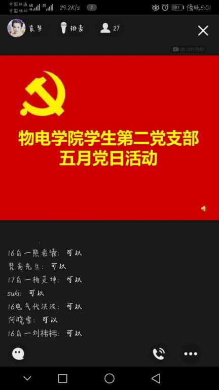 5月28日下午,太阳集团tyc5997学生第二党支部在QQ网络课堂平台开展了线上党日活动,会议由学生第一党支部书记袁梦同志代为主持。